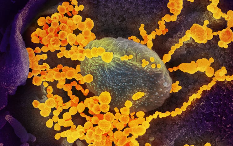 Cette image de microscope électronique à balayage montre le coronavirus SARS-CoV-2 (sphères dorées – fausses couleurs) émergeant de la surface de cellules cultivées en laboratoire.